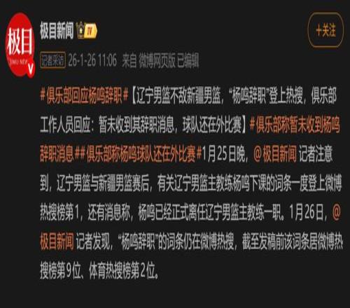辽宁男篮辟谣!未收到杨鸣辞职申请,不能想走就走!